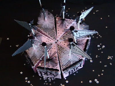 This is one of my favorite projects that I have done lately. For Scrapfest I designed a class that puts 8 little triangle boxes together to form a "cake" - I was inspired to go with pink and black (I am in a pink and black phase) theme and use these boxes for the girls next birthday party. We have already ordered decorations and party favors 6 months ahead. we are having a "pink poodle in Paris" party, its the big thing right now. all the party stores are carrying plates, napkins, etc. that have pink poodles on them.